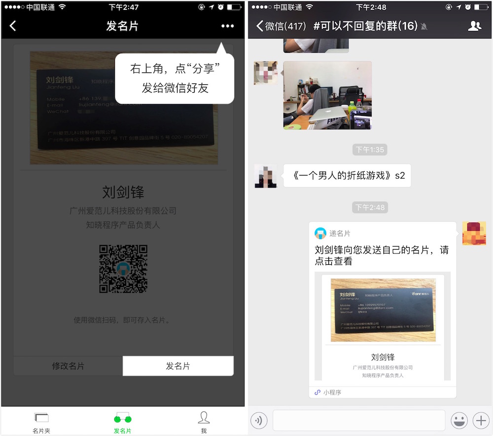 將自己的名片,通過(guò)微信分享給對(duì)方。在微信群中,一鍵收集所有人的名片,并向?qū)Ψ椒窒碜约旱拿?。與對(duì)方見(jiàn)面時(shí),互相掃描對(duì)方的名片二維碼。